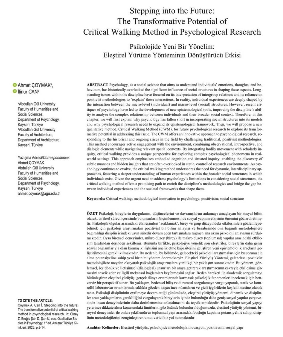 Bölümümüz öğretim üyelerinden Doç. Dr. Ahmet Çoymak ve Mimarlık Bölümü araştırma görevlisi İlinur Can’ın birlikte kaleme aldıkları “Stepping into the Future: The Transformative Potential of Critical Walking Method in Psychological Research” başlıklı makale Qualitative Studies in Psychology dergisinde yayımlanmıştır.