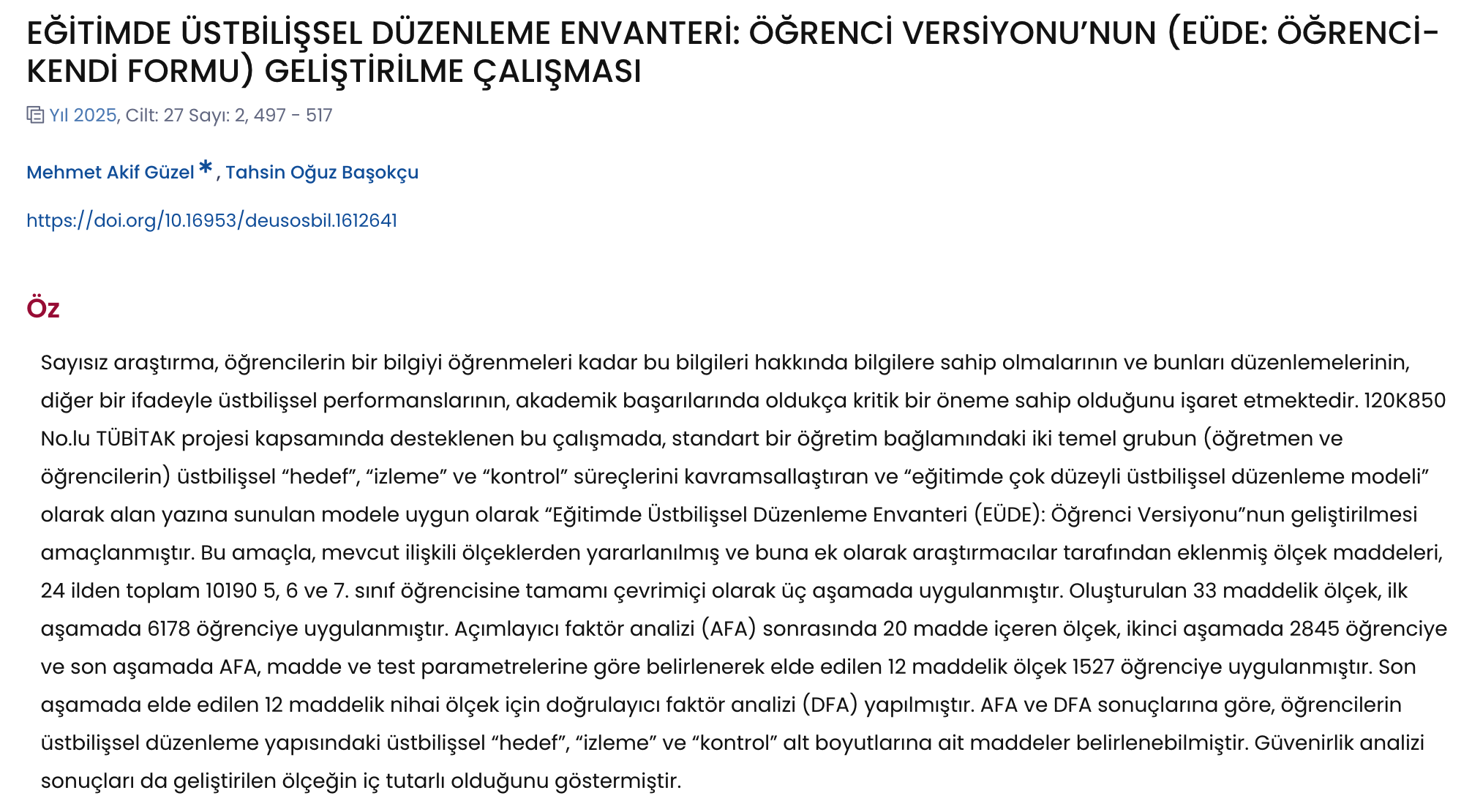 Psikoloji bölümü öğretim üyelerinden Dr. Güzel'in "Eğitimde Üstbilişsel Düzenleme Envanteri: Öğrenci Versiyonu’nun (Eüde: Öğrenci-Kendi Formu) Geliştirilme Çalişmasi" başlıklı ilk yazarlı çalışması Dokuz Eylül Üniversitesi Sosyal Bilimleri Enstitüsü Dergisi'nde yayımlandı.